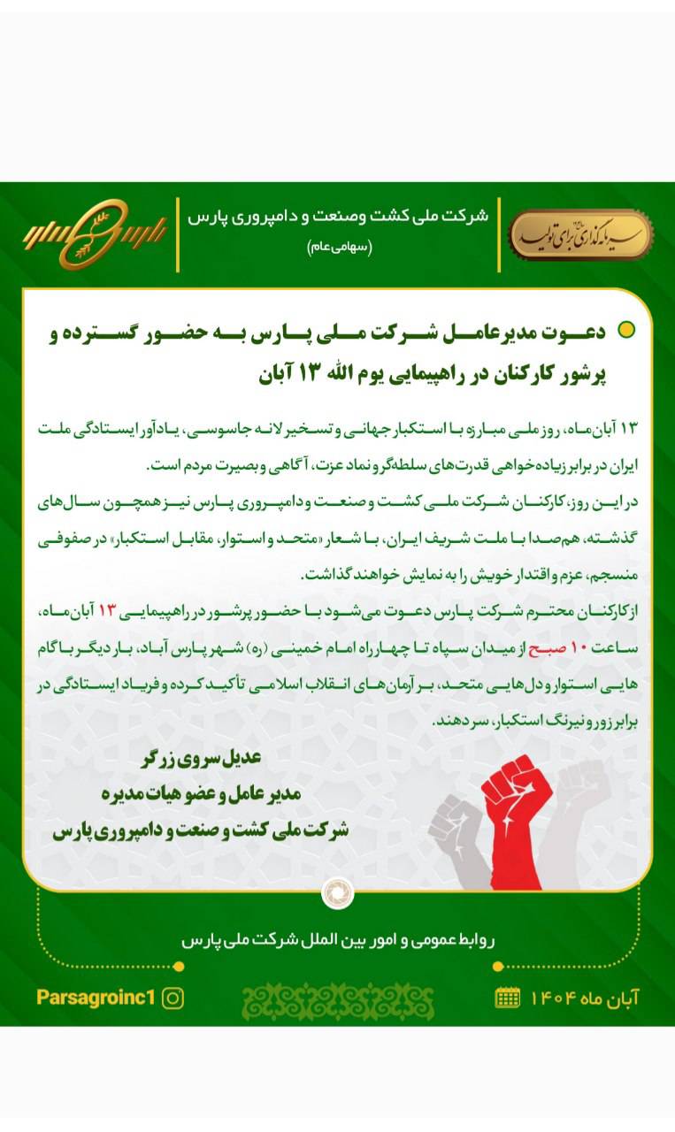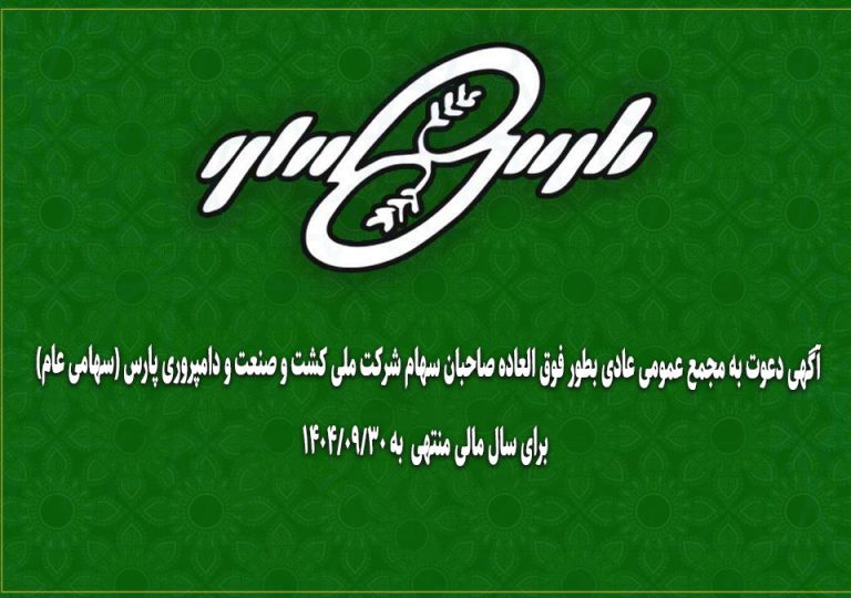 آگهی دعوت به مجمع عمومی عادی بطور فوق العاده صاحبان سهام شرکت ملی کشت و صنعت و دامپروری پارس (سهامی عام) برای سال مالی منتهی به ۱۴۰۴/۰۹/۳۰