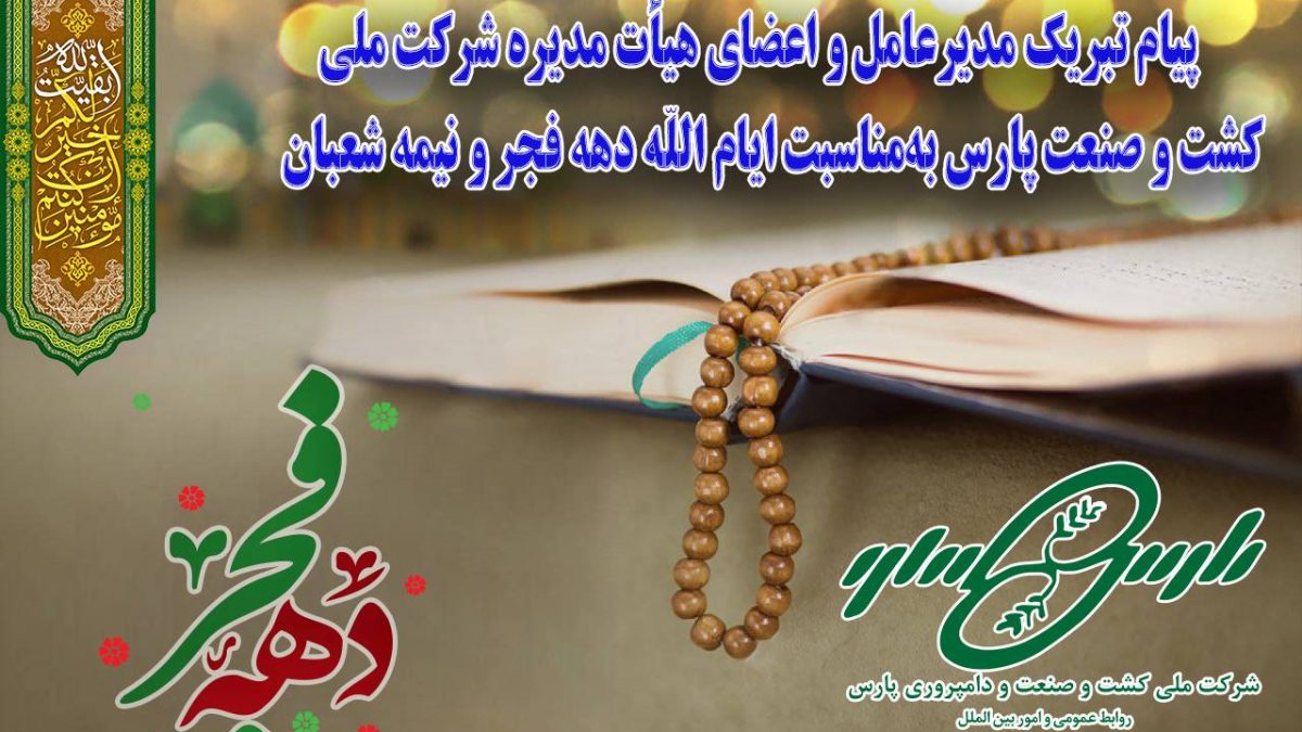 تقارن ماه پر خیر و برکت شعبان با ماه شکوهمند بهمن که نماد انقلاب اسلامی ایران است را ارج نهاده و پیوند طلوع خودباوری ملت ایران اسلامی با میلاد حضرت ولیعصر (عج) را که فرصتی برای تجدید عهد با آرمانهای بزرگ و ارزشمند اسلامی است؛ را گرامی میداریم.ایام الله دهه فجر، حماسهای بزرگ و نقطه عطفی در تاریخ پر افتخار ایران اسلامی است که با رهبری حکیمانه امام خمینی (ره) و مجاهدت ملت ایران به ثمر نشست.اینجانبان فرارسیدن چهل و هفتمین سالروز پیروزی شکوهمند انقلاب اسلامی ایران و همچنین میلاد پر خیر و برکت امام زمان (عج) را به تمامی کارکنان خدوم و متعهد شرکت ملی کشت و صنعت و دامپروری پارس تبریک عرض نموده و از درگاه خداوند متعال، متواضعانه برای تعجیل در فرج حضرت ولیعصر (عج)، دست به دعا بلند میکنیم.امید است با اتکال به خداوند متعال و الهام از اندیشههای والای انقلاب اسلامی، در مسیر پیشرفت، عزت و شکوفایی ایران اسلامی، گامهایی استوار و ماندگار در مجموعه شرکت ملی پارس برداریم.