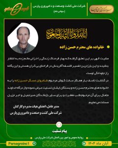 در گذشت تاسف بار همکار سخت کوش مرحوم شادروان عسگر حسن زاده را به خانواده های محترم حسن زاده و بستگان ایشان تسلیت عرض نموده واز درگاه خداوند متعال برای آن مرحوم طلب مغفرت و برای سایر بازماندگان صبرجمیل و اجر جزیل مسئلت می نماییم.